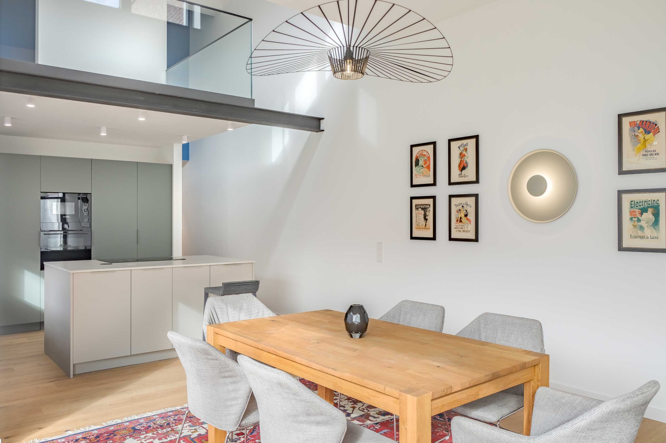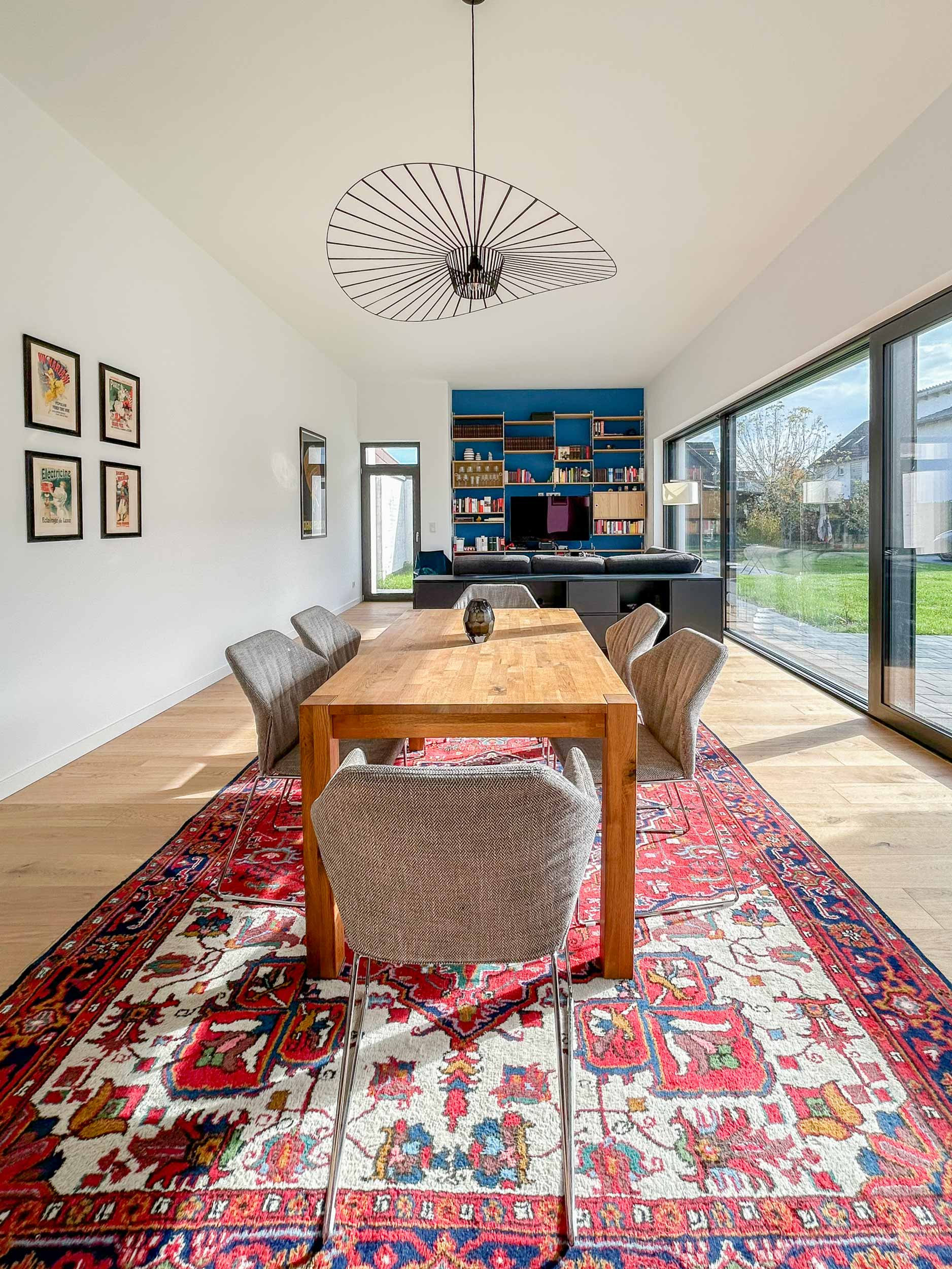 Entstanden ist ein Familienhaus mit klarem architektonischen Konzept, funktionaler Grundrisslogik und hochwertiger Gestaltung – ein Zuhause, das nicht nur ästhetisch überzeugt, sondern sich auch im Alltag bewährt. Die Räume sind großzügig, lichtdurchflutet und folgen einer ruhigen, modernen Formensprache. Materialien wie Eichenholz, Terrazzo, farbig lackierte Fronten und ausgewählte Leuchten schaffen eine warme, einladende Atmosphäre mit durchgängig hoher Detailqualität.
