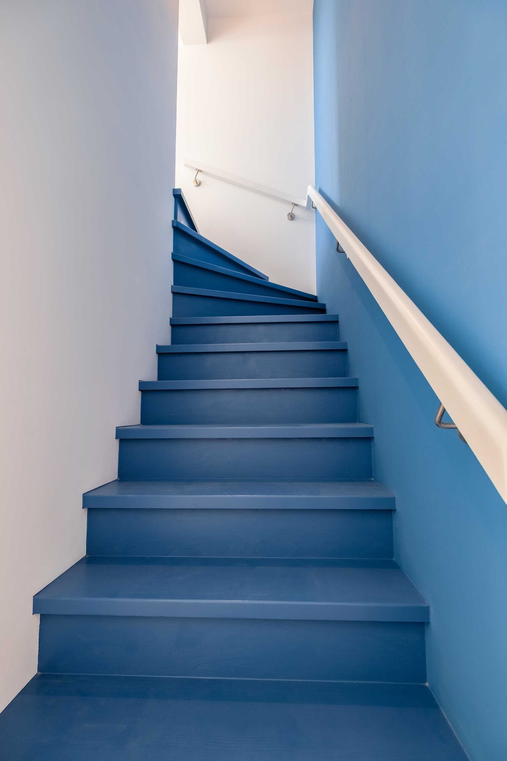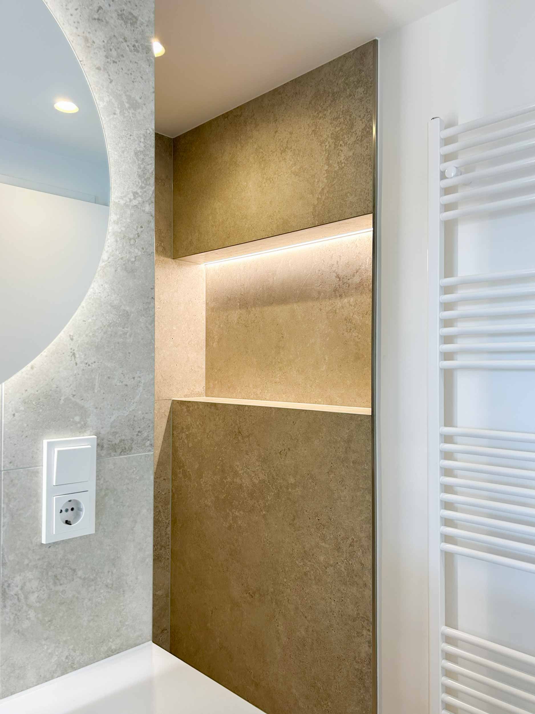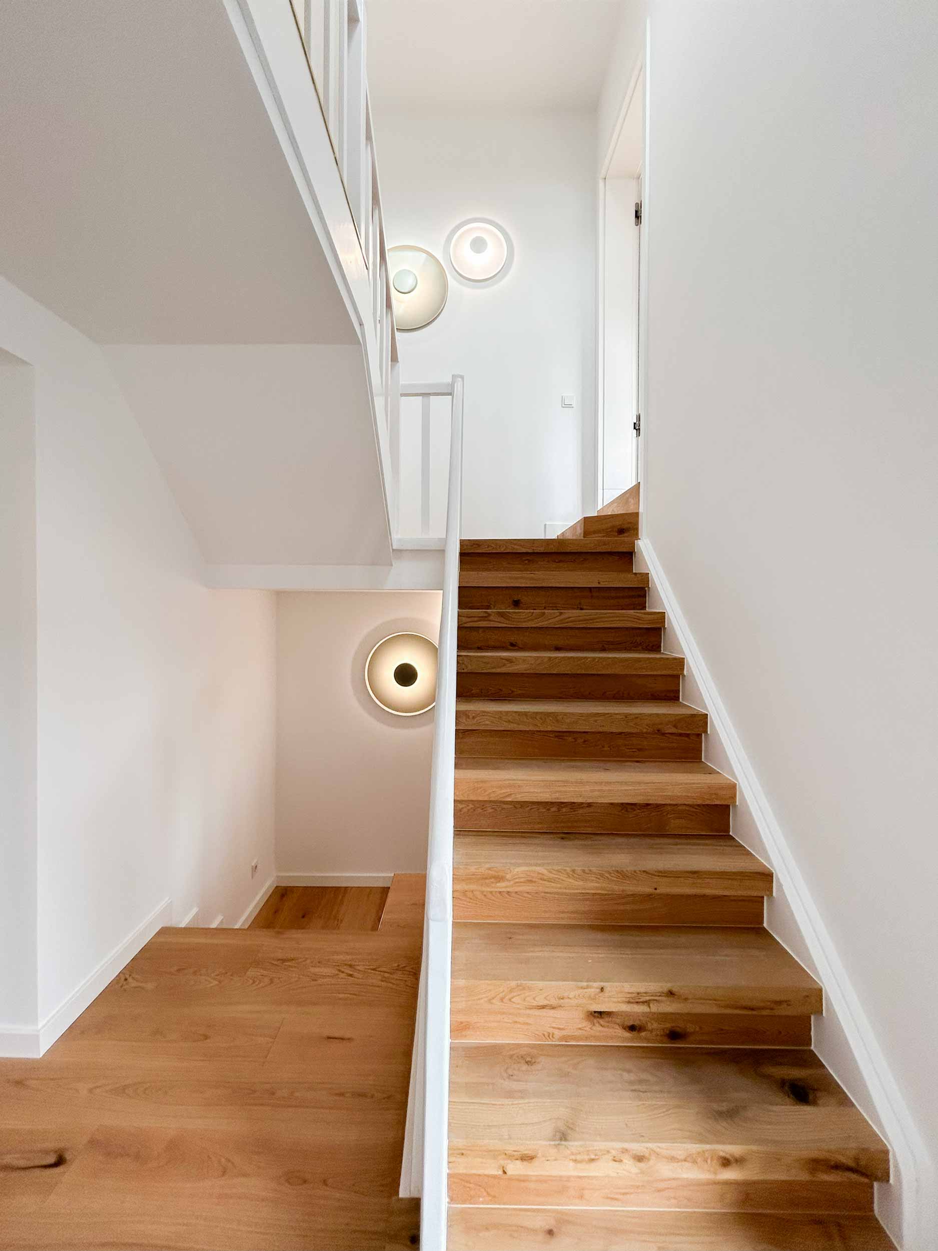 Auch die Materialwahl im Bestand folgt der gestalterischen Linie des Neubaus: Echtholzparkett in breiten Dielen, feine Oberflächen, stumpf einschlagende Türlösungen und ein bewusst reduzierter Farbkanon schaffen eine ruhige, elegante Atmosphäre. Bestehende Elemente wie das Treppenhaus wurden modern interpretiert und mit neuen Lichtakzenten ergänzt.