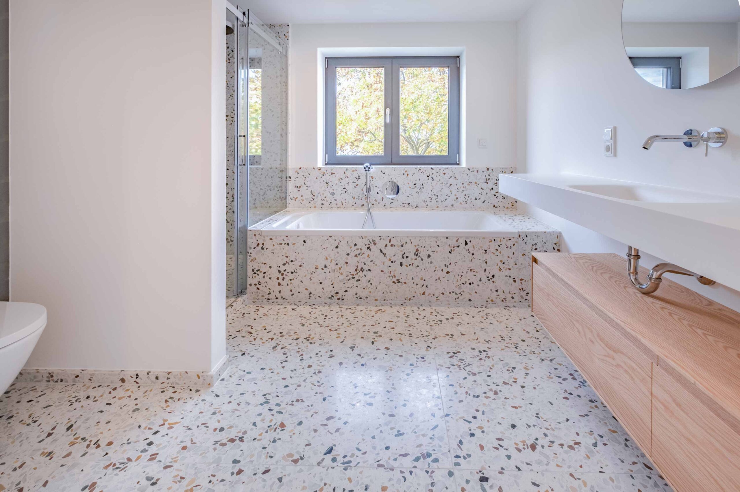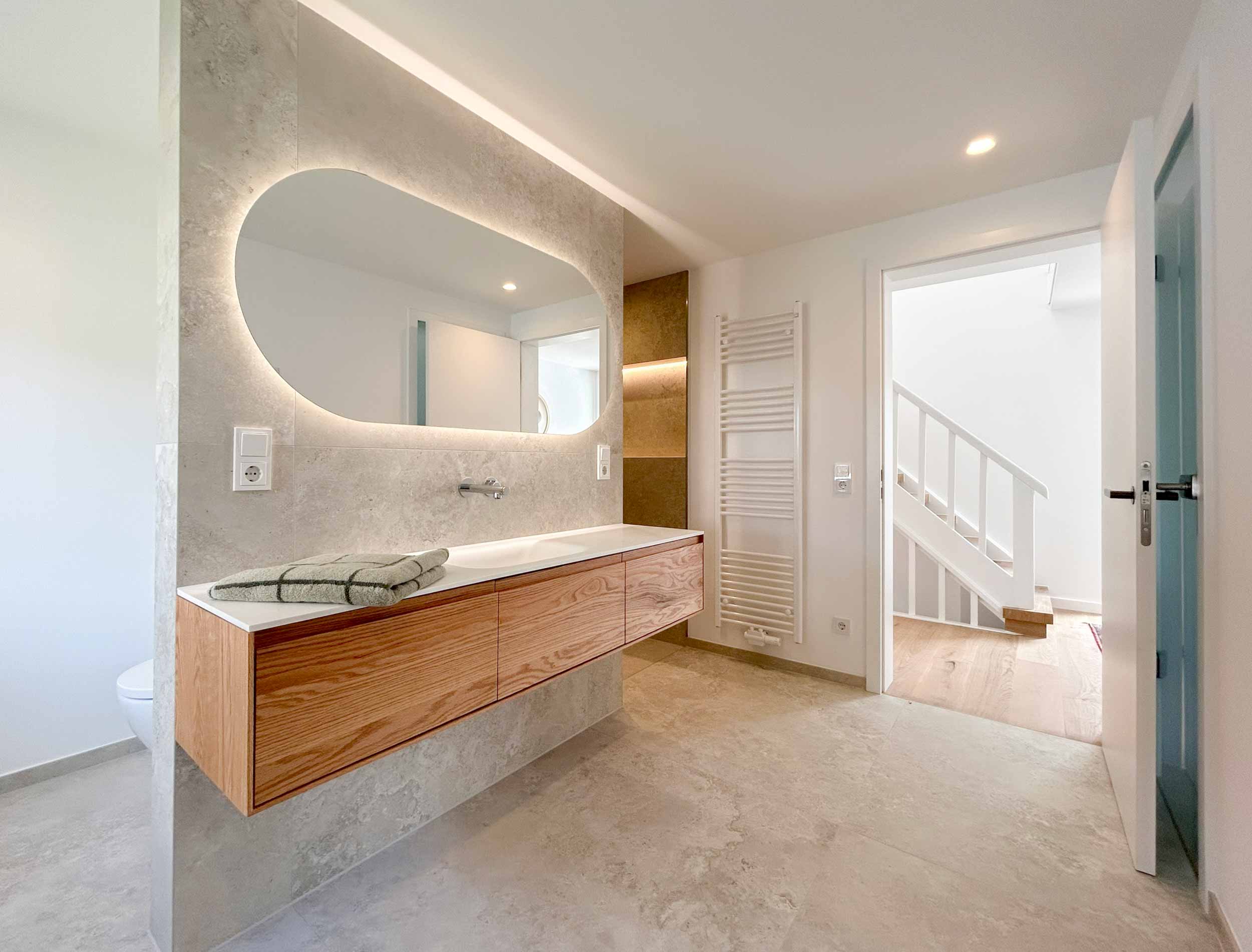 Der ursprüngliche Gebäudeteil aus den 1960er Jahren wurde umfassend kernsaniert und neu strukturiert. Die Grundrisslogik wurde modernisiert, um die Räume funktionaler und alltagstauglicher zu gestalten. In den oberen Geschossen befinden sich heute die privaten Rückzugsorte der Familie: großzügig geschnittene Schlafzimmer, ein Kinderbereich mit clever integrierten Stauraumlösungen sowie ein Tageslichtbad mit Terrazzo-Oberflächen und individuell angefertigtem Waschtisch.