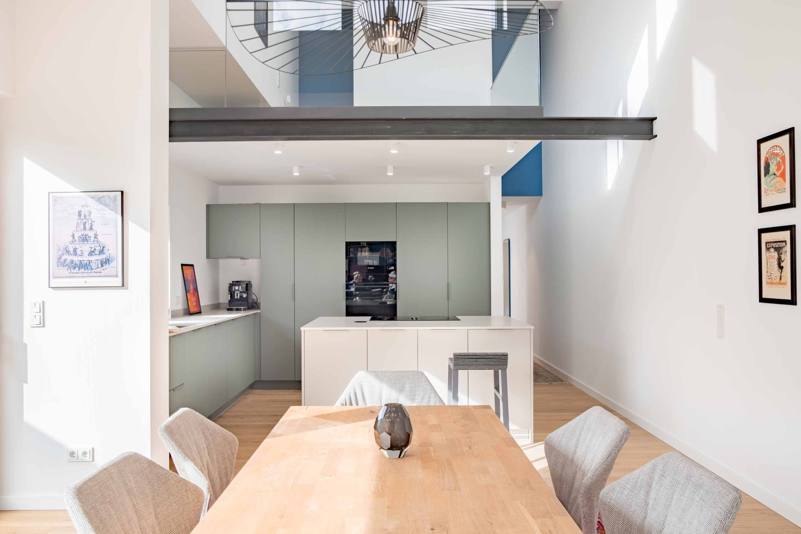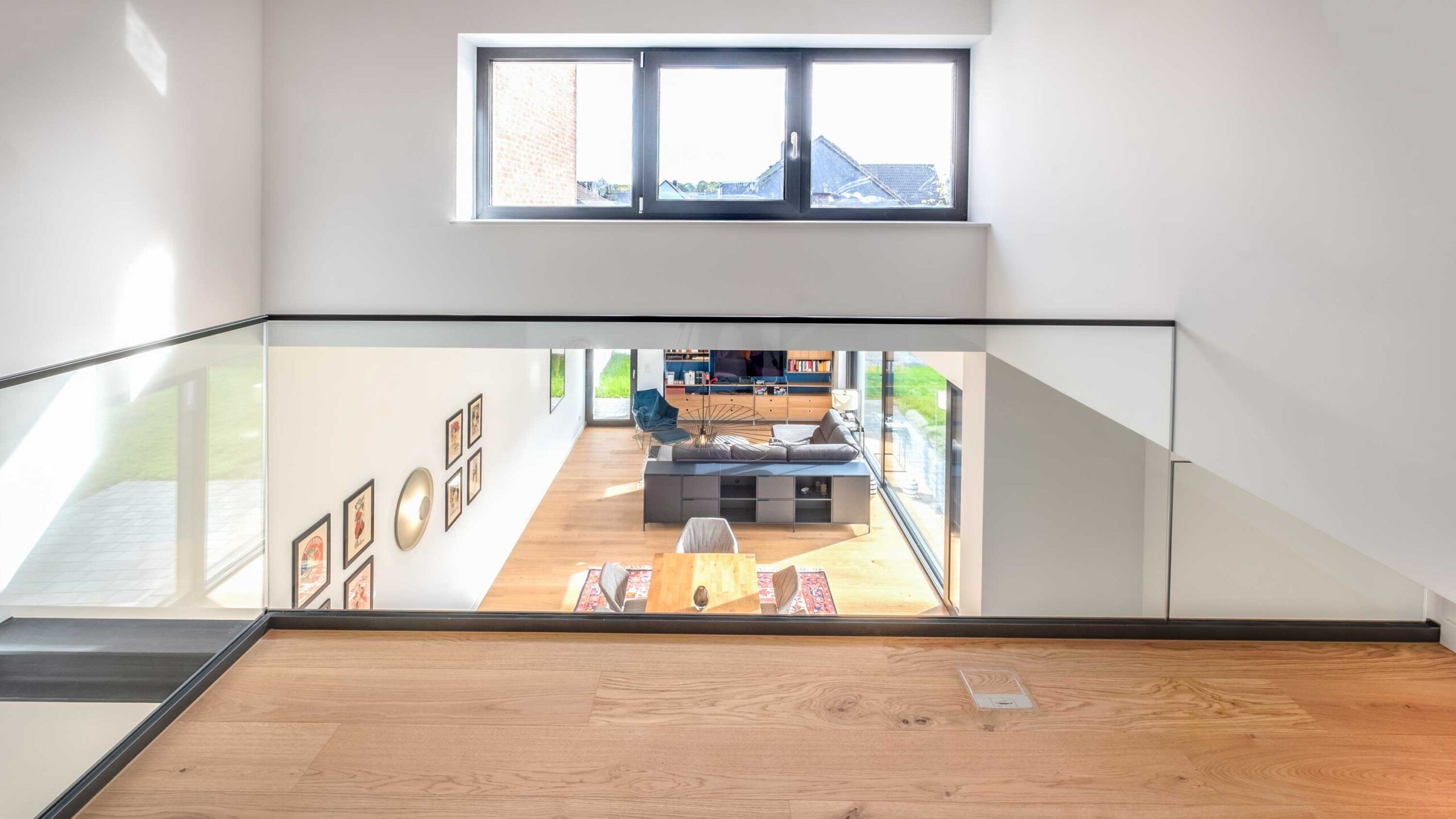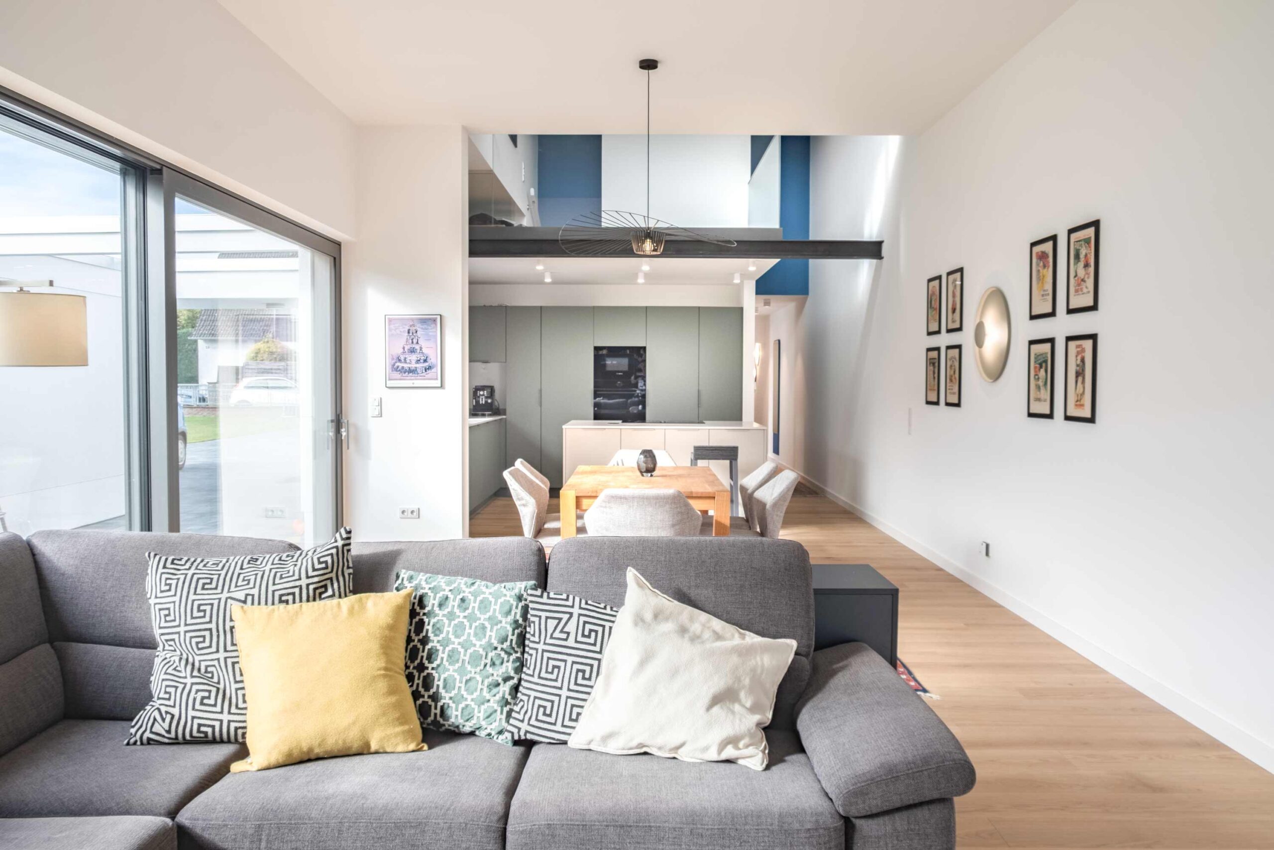 Im Erdgeschoss vereinen sich Küche, Essbereich und Wohnzimmer zu einem offenen Wohnbereich mit fließenden Übergängen. Ein zentrales Gestaltungselement ist die offene Galerie, die als luftiges Homeoffice im Obergeschoss dient – mit direkter Verbindung zum Wohnbereich. Die Raumhöhe, das große Schiebeelement zur Terrasse und gezielt gesetzte Farbakzente verleihen dem Anbau eine moderne Großzügigkeit mit architektonischer Klarheit.