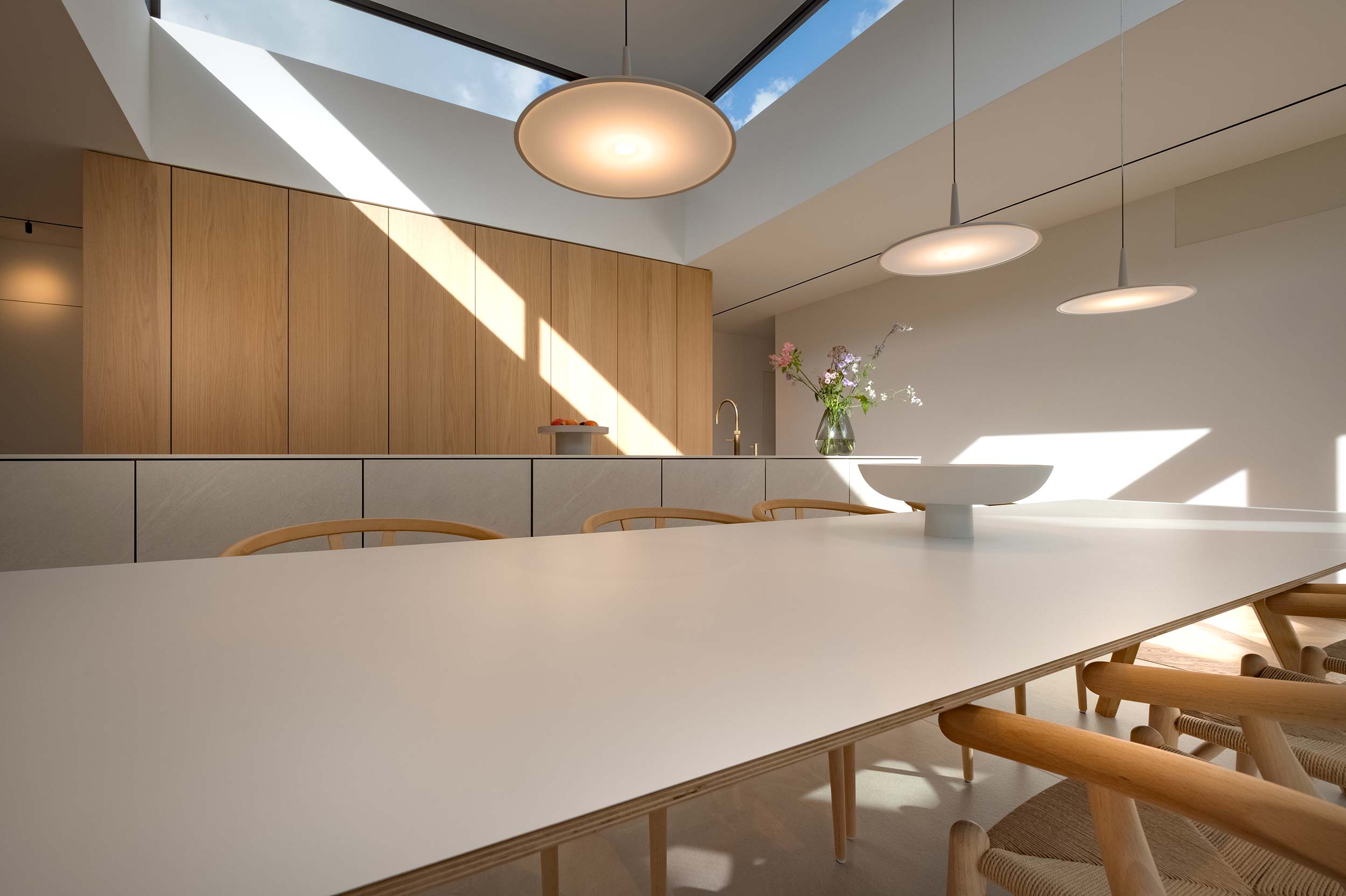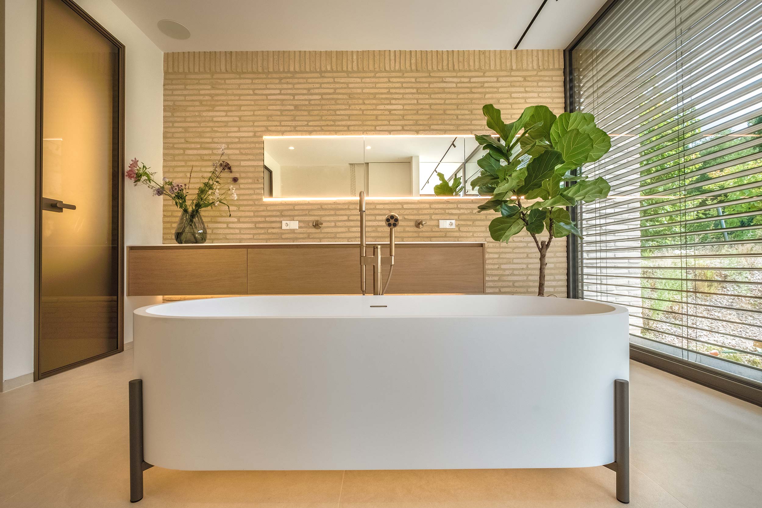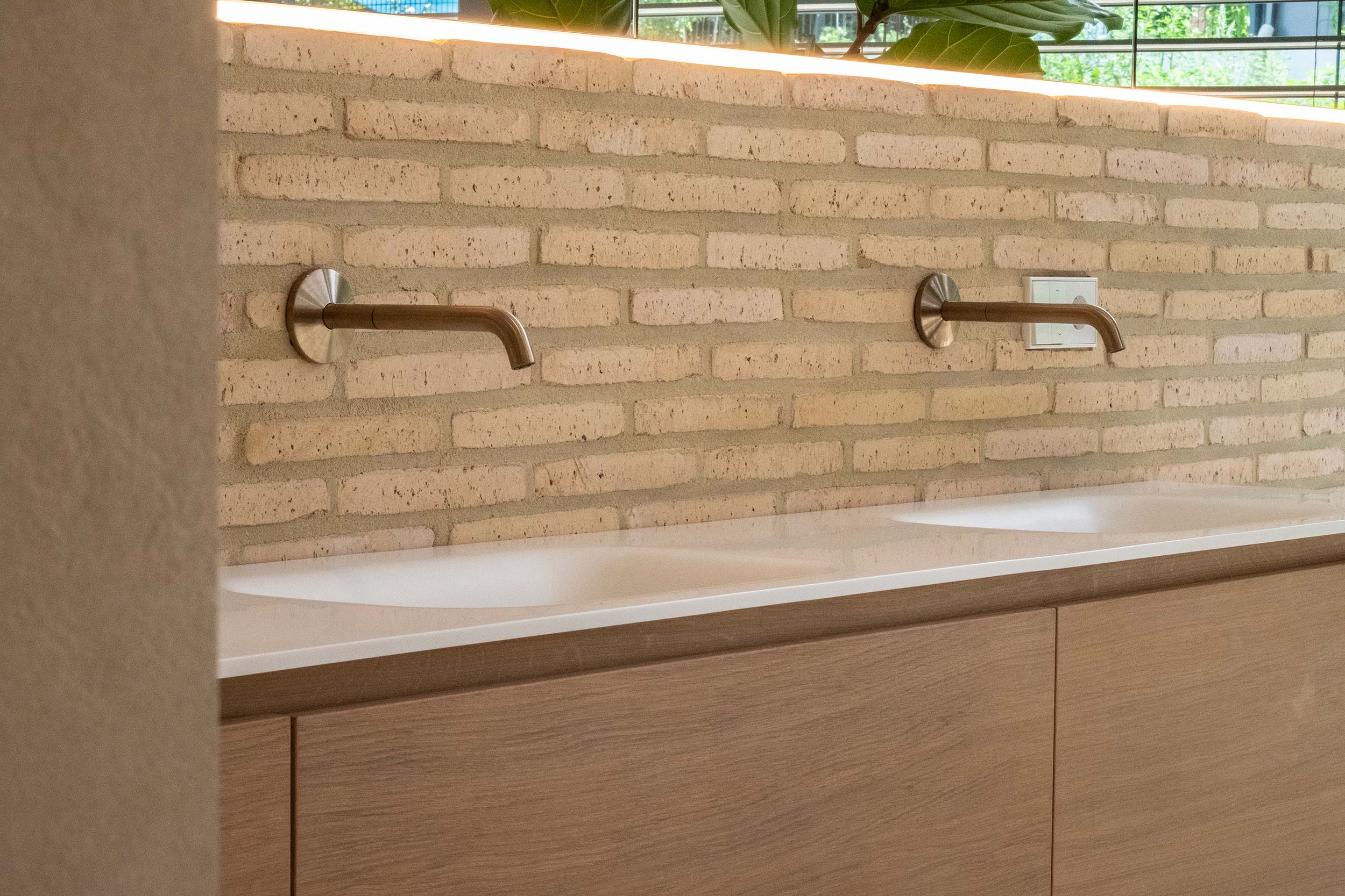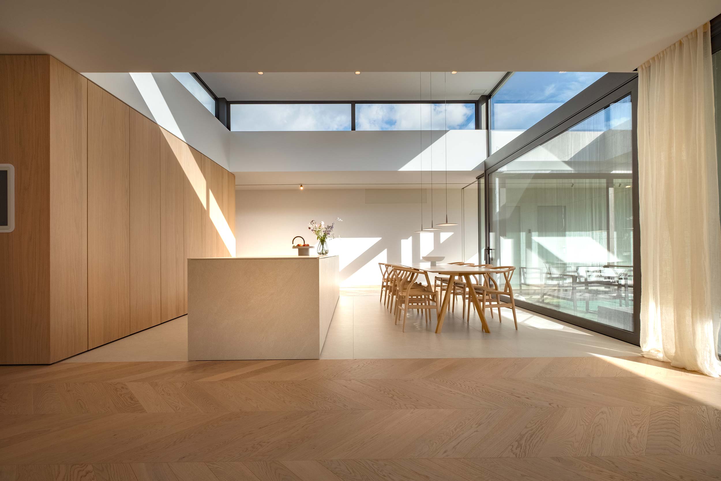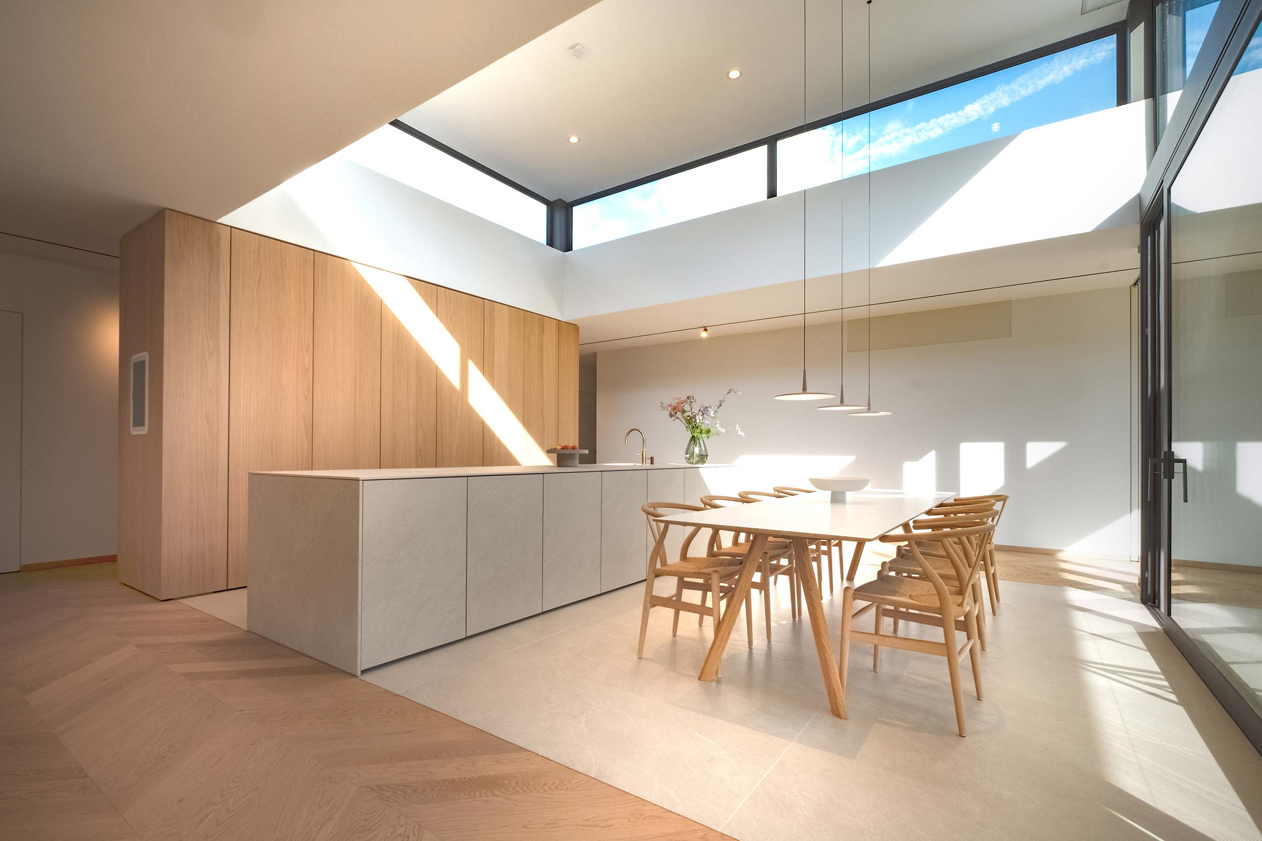 Besonderes Augenmerk wurde auf die Materialwahl gelegt, um das Gebäude sowohl ästhetisch als auch ökologisch in das Umfeld zu integrieren. Der handgebrannte, offenporige Klinker in sanften Beigetönen harmoniert perfekt mit den Erdfarbtönen der Umgebung und sorgt für eine angenehme Verbindung zum Wald. Die Nutzung eines Gründachs verstärkt zusätzlich die Integration des Hauses in die natürliche Umgebung und unterstützt die ökologische Balance.