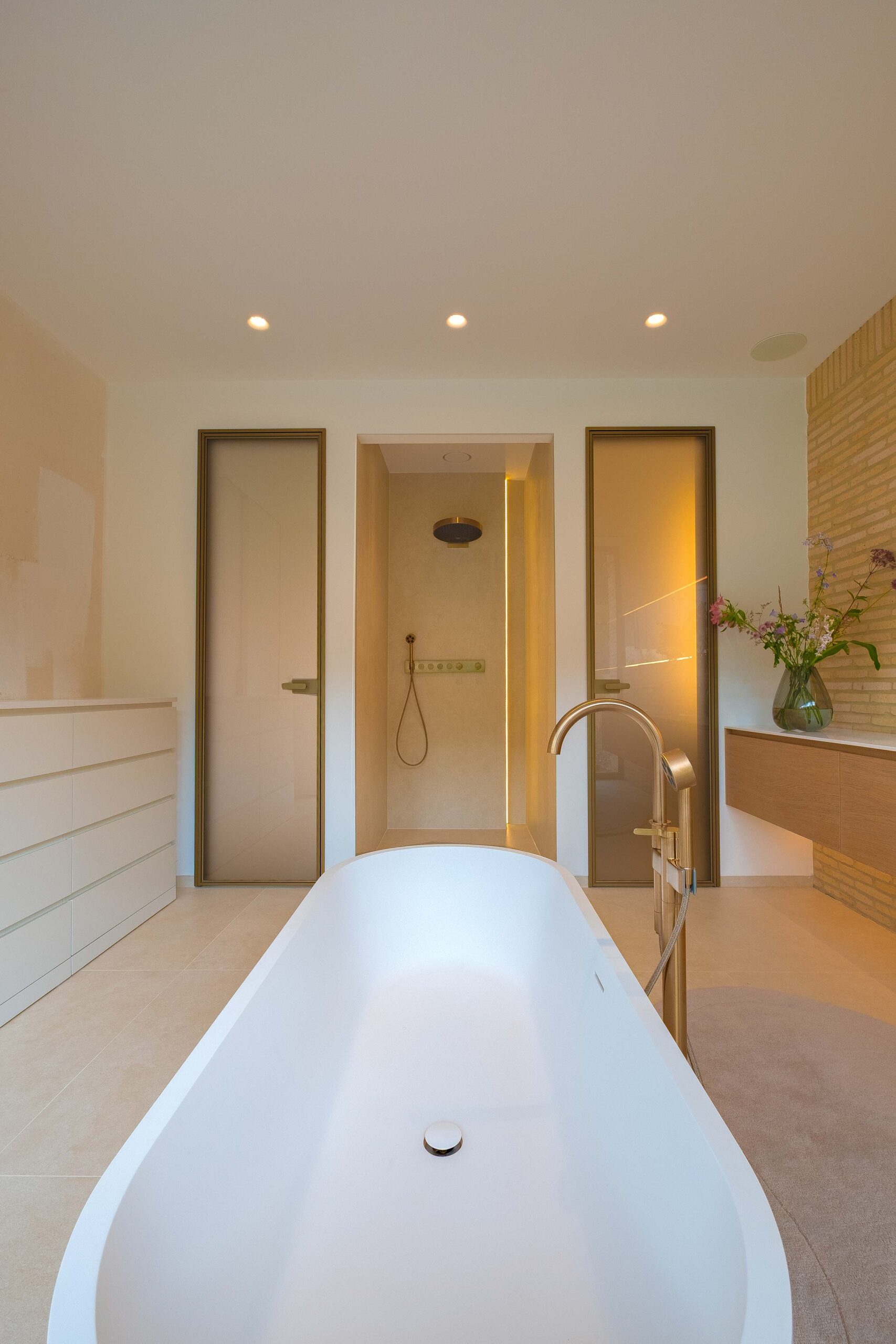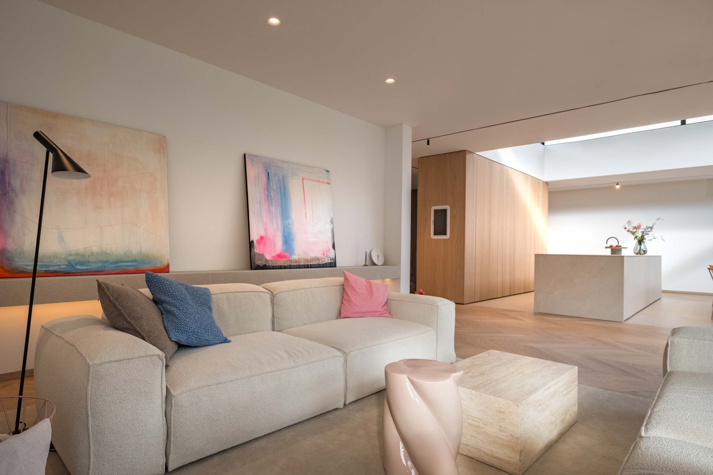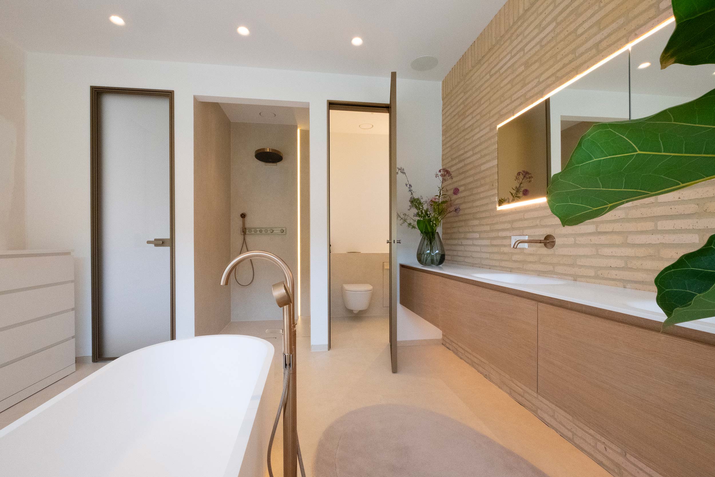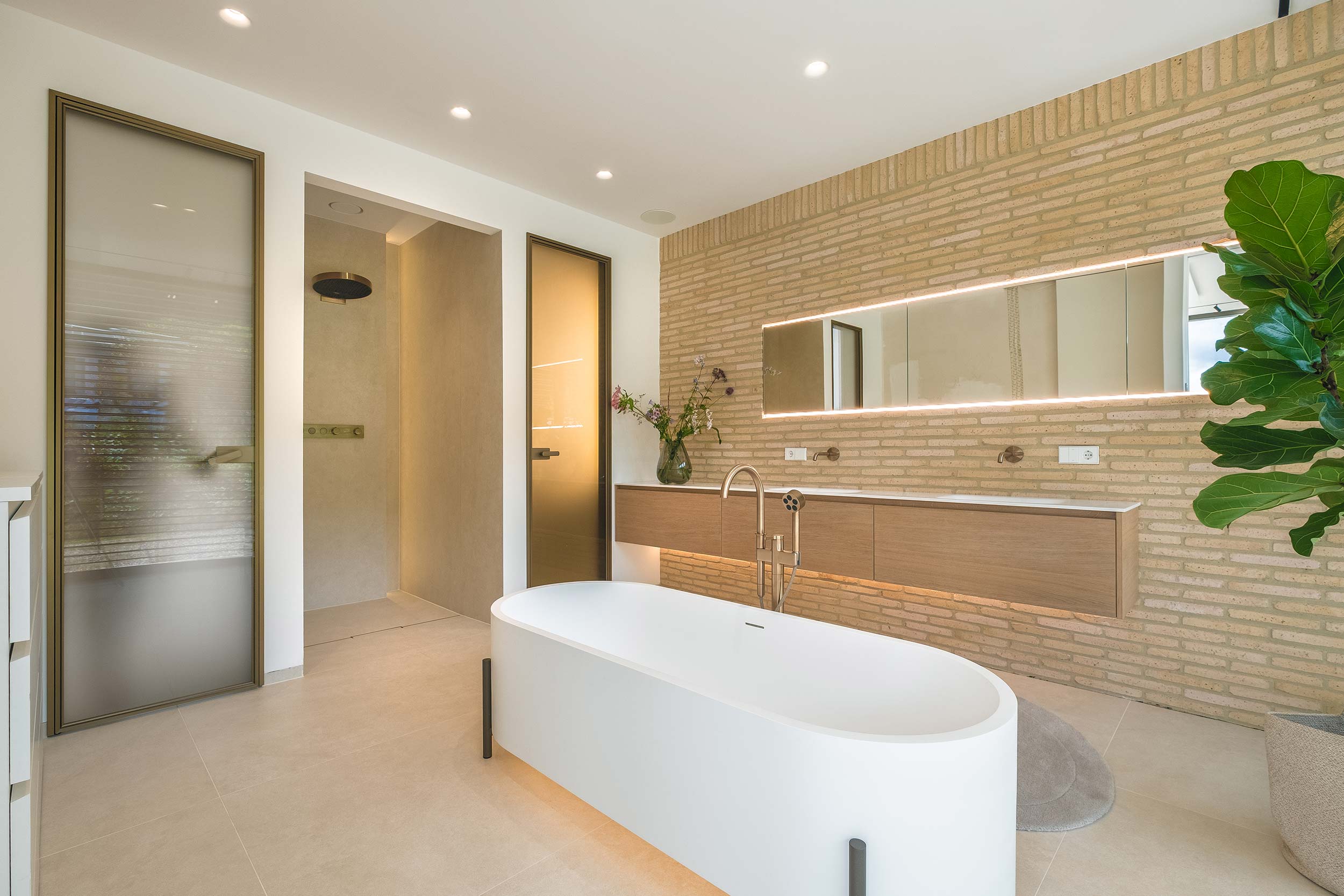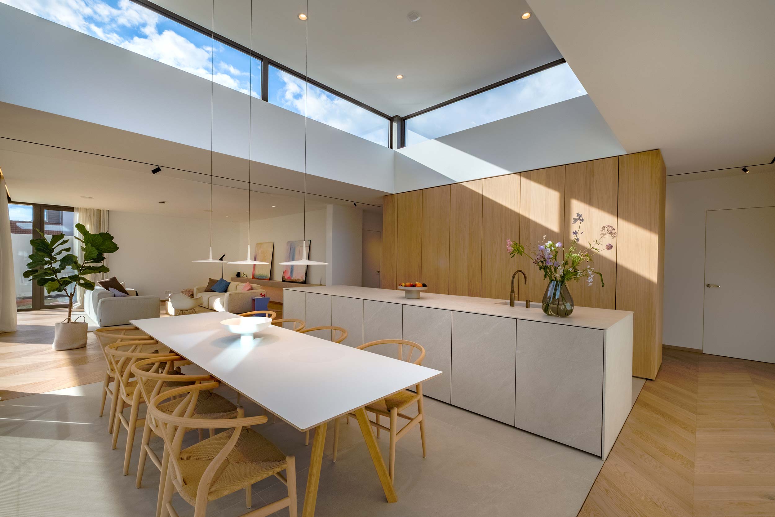 Besonderes Augenmerk wurde auf die Materialwahl gelegt, um das Gebäude sowohl ästhetisch als auch ökologisch in das Umfeld zu integrieren. Der handgebrannte, offenporige Klinker in sanften Beigetönen harmoniert perfekt mit den Erdfarbtönen der Umgebung und sorgt für eine angenehme Verbindung zum Wald. Die Nutzung eines Gründachs verstärkt zusätzlich die Integration des Hauses in die natürliche Umgebung und unterstützt die ökologische Balance.